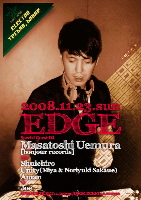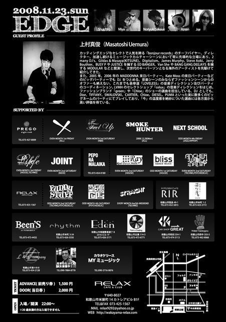 管理人様告知失礼します。 11/23(sun)@RELAX wakayama "EDGE" open/start 22:00〜 ADV:1500 DOOR:2000 【special guest DJ】 Masatoshi Uemura(bonjour records/off the rocker) ↓↓ masatoshi uemura: http://profile.myspace.com/index.cfm?fuseaction=user.viewprofile&friendid=101376137 bonjour records: http://www.bonjour.co.jp/index_coverart.html カッティングエッジなセレクトで人気を誇る「bonjour records」のチーフバイヤー、ディレクター。 加速し続けるミュージックカルチャーシーンにおいて常に先導