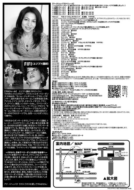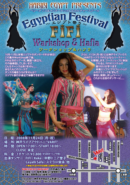 管理人様 告知を失礼いたします。どうぞ宜しくお願い致します!! *********************************** HABIBI EGYPT Presents 〜 エジプト祭り〜 "FIFI" ハフラ&ワークショップ *********************************** 10、11月と本場エジプトのダンサー"FIFI"が来日! 11/24は彼女のさよならパーティを兼ねて、見応えたっぷりのショーが開催されます!!どうぞお楽しみに〜 お祭り〜お祭り〜♪ *FIFIのワークショップは現在もHABIBI