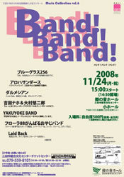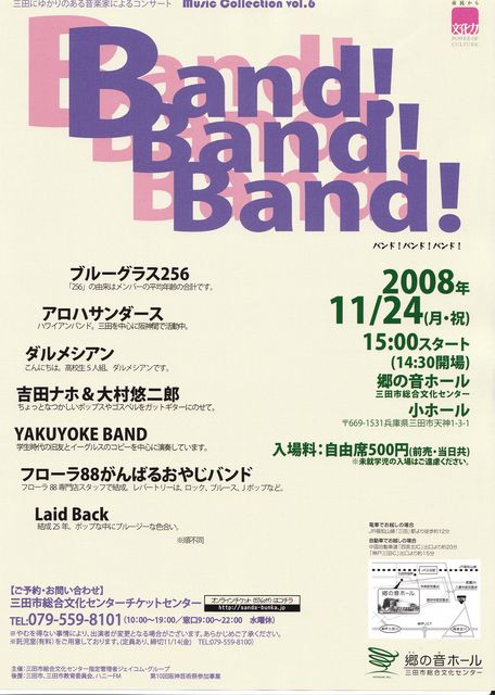 郷の音ホールで開催されているミュージックコレクションの第6回は、三田ゆかりのバンドの演奏会「Band!Band!Band!」 ばんばんばん!と読むのが正しいんだそうです。 高校生のロックバンドからブルーグラス、ハワイアンまで老若男女7バンドが夢の?共演。 三田近郊でバンドをやっている人はもちろん、音楽好きの皆さん、みんな集まって盛り上げてくださいね!!! 詳しくは下記のHPをご覧ください http://www.sanda-bunka.jp/event/details/081124.html