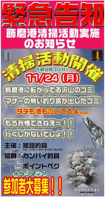 姫路港の通称1万トン岸壁において、11月24日姫路釣具さん主催の清掃活動が開催されます。 タチウオシーズン真っ只中で連日タチキチさんで賑わう同釣り場ですが、心無い釣り人が捨てるゴミで非常に汚く、また港湾で仕事をされている方々に非常に迷惑となっております。 釣り禁止、立入禁止も目前となっている危機的状況です。 自分で出したゴミは自分で持ち帰る、そんな当たり前のことが何故できないのでしょうか? 姫路の貴重な釣り場を釣り人の手で綺麗にし、明日の釣り場を守ろうではありませんか