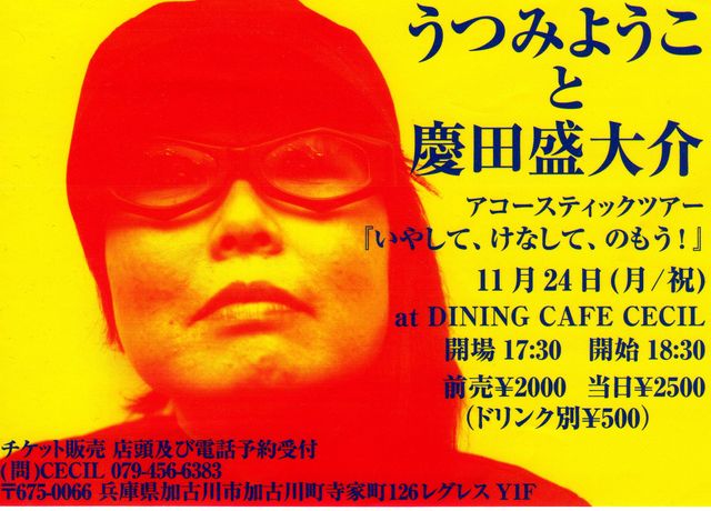 もう当日になっちゃいましたが (更新がいつも遅くてすみません) うつみようこと慶田盛大介 アコースティックツアー 『いやして、けなして、のもう!』 11月24日(月/祝) at DINING CAFE CECIL 開場17:30 開始18:30 前売\2000 当日\2500 (ドリンク別\500) チケット販売 店頭及び電話予約受付 (問)CECIL 079-456-6383 〒675-0066 兵庫県加古川市加古川町寺家町126イグレスY1F 何回目のCECILライブでしょうか?? 12月12日にもライブがあるので。 そちらはもうちょっと早くUPしたいと考えております