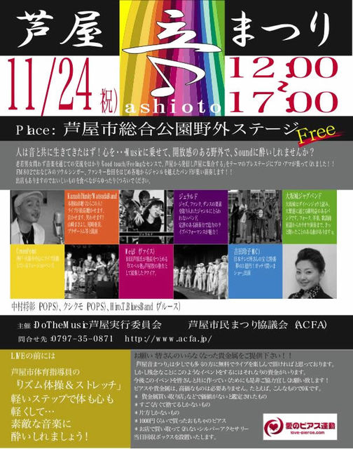 芦屋音まつり -ashioto- @芦屋市総合運動公園(芦屋市陽光町1番1号 阪急バス71系統芦屋市総合公園前下車すぐ お車の方は駐車場あります) 芦屋市総合公園野外ステージでのLIVEにジェラルド出演が決まりました!!(アコギじぇらるどでの出演になります) 12:00〜17:00までのイベントで、 ジェラルドの出演時間は13:55の予定です。 チケットFREEですので、 ぜひ遊びに来てください☆ お待ちしてますー♪ 主催 DoTheMusic芦屋実行委員会・芦屋市民まつり協議会(ACFA) お問い合わせ 0797-35-0871 http://www.a