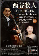 奈良県出身の新進気鋭のチェリスト西谷牧人さんのチェロリサイタルが奈良県立図書情報館で開催されます。 参考URL http://eventinformation.blog116.fc2.com/blog-entry-99.html 主催:奈良県立図書情報館 開催日時:平成20年11月24日(月・祝) 14:00〜15:00(開場13:00) 会場: 県立図書情報館2階メインエントランスホール 演 奏 西谷 牧人(チェロ)奈良田 朋子(ピアノ) 定 員 200名(応募多数の場合は抽選) 1/14(金)必着 参加無料 〜西谷さんから一言〜 「のだめカンタービレ」でも話題になった、ラフ