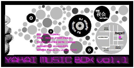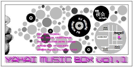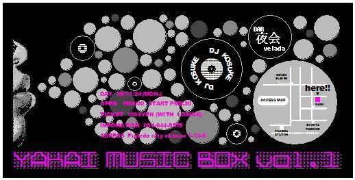 管理人様スペースお借りしますm(__)m ウチの店でのイベント告知をさせてください。 2008.11.24… BAR夜会での初音楽イベント YAKAI MUSIC BOX vol.1 をやっちゃいます 普段はのんびりまったりできる空間が DJブースをつくってCLUB風に HOUSE、HIP HOP、SOUL…いろんなジャンルの音楽を流して音とお酒を楽しむイベントです 入場は1人1000円で1drink付 ドリンクはALL 500円 そして先着50名に特製缶バッ