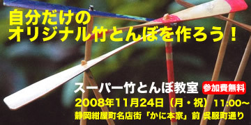 2008年11月24日(月・祝) 静岡紺屋町名店街で竹とんぼの製作と飛ばす体験教室を行います。 竹とんぼの製作指導には「どこ竹@しずおか竹とんぼ会」が行いますので 驚くほど良く飛ぶ竹とんぼを体験していただく事が出来ます。 当日はヤスリで削ったり、竹を曲げたり、色を塗ったりと自由に 自分だけの竹とんぼを作ってお持ち帰りいただけます。 参加費は無料となっておりますが、定員を先着30名とさせていただきます。 日時:2008年11月24日(月・祝)11:00から約90分ほど 場所:静岡紺屋町名店街 「かに本家」前 費用:無料 申込: