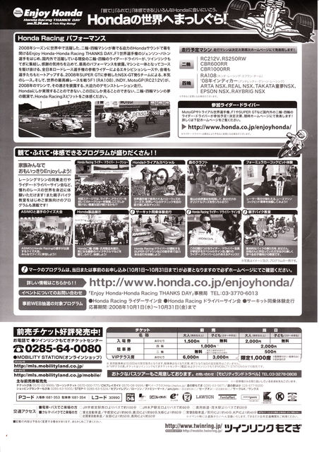 来週の三連休の最終日の24日、このイベントに行きます http://www.honda.co.jp/enjoyhonda/thanksday/ 昨年、初めて見に行ったのですが、 もてぎのオーバルコースを、MotoGPマシン、F1、インディカーが 全開で並走するのを、間近で見れて、凄く楽しかったですよ。 バイクでの前売り券は1500円(駐車料金込み)当日は2500円です。 詳しくはHP参照で マシンが走るだけじゃなく、他にも色々とイベントがいっぱいです。 一緒にツーリングしませんか〜?って企画じゃなく、 行く人いたら、もてぎまで一緒に行きませんか?