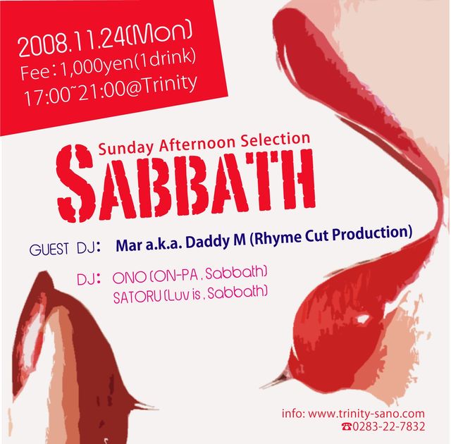 Sunday Afternoon Selection Sabbath vol.03 2008.11.24(Mon) 17:00~21:00 @TRINITY Fee:1,000yen(1drink) GUEST DJ MAR a.k.a DADDY M(RHYME CUT PRODUCTION) DJ: ONO(ON-PA , Sabbath) SATORU(Luv is , Sabbath) DJ MAR a.k.a Daddy M (Rhyme Cut Production) MID 90’Sアンダー物〜クラシックを見事にMIX。NUJABES氏や、MITSH THE BEATS氏などなど多彩なゲストを招聘/競演を果たし、北関東のクラブシーンの底上げに尽力した伝説的なイベント「LOOP GROOVE」の主催者でもあり、先日リリースした12”アナ