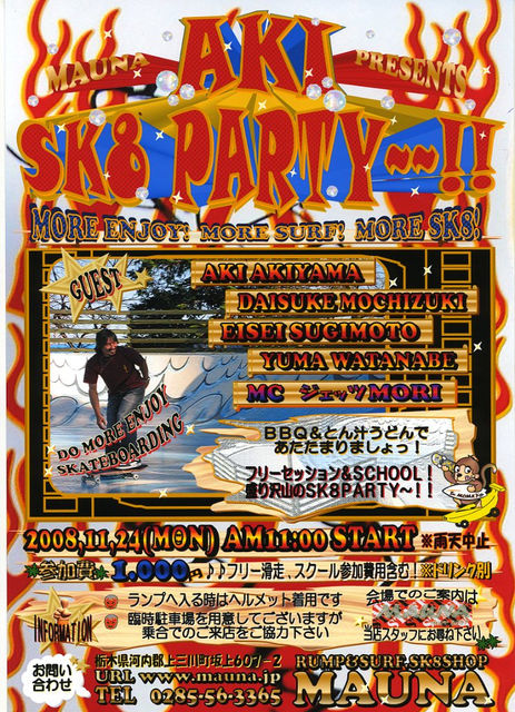 11月24日(月) AM11:00START ※雨天中止 ゲスト AKI AKIYAMA DAISUKE MOCHIZUKI EISEI SUGIMOTO YUMA WATANABE MC ジェッツMORI 参加費 1.000円 ☆フリーセッション&スクール費込み※ドリンク別 当日は、BBQ&とん汁うどん、焼きもちなどなど食べながら 楽しいSKATE
