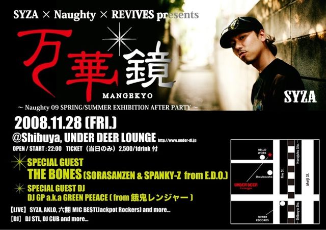 08.11,28(FRI) SYZA×Naughty×REVIVES presents  Naughty 09 SPRING/SUMMER EXHIBITION AFTER PARTY!! 『万華鏡』@渋谷UNDER DEER LOUNGE OPEN 22:00〜  TICKET(当日のみ)2,500/1D 「SPECIAL GUEST」 THE BONES(SORASANZEN a.k.a JESSE(RIZE)&DJ SPANKY-Z from E.D.O) 「SPECIAL GUEST DJ」 DJ GP a.k.a GREEN PEEACE(from 餓鬼レンジャー) 「LIVE」 SYZA AKLO 六翻MIC BEST(Jackpot Rockers)  and more.. 「DJ」 STL(Naughty) CUB  and more.. *SYZA主催のイベント「万華鏡