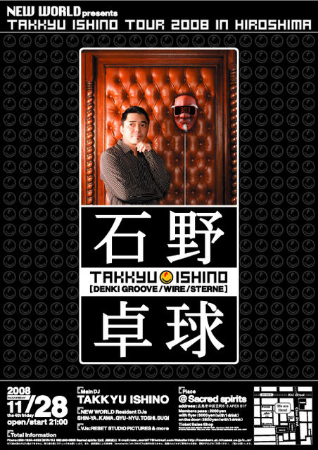 石野卓球ツアー2008広島、開催決定です。 電気グルーヴは10月にアルバムも出ましたし 良い感じな時に広島なので皆さん是非! チケット早めに確保して下さい。 問い合わせはお気軽に。チケット取り置きも出来ます。 メッセージ下さい。 NEW WORLD presents TAKKYU ISHINO TOUR 2008 in HIROSHIMA 2008.11.28.(fri) open/start 21:00 @Sacred Spirits(cafe JAMAICA) セイクリッド スピリッツ (カフェ ジャマイカ) 広島市中区立町6-3-B1F http://map.yahoo.co.jp/pl?lat=34.38984812&lon=132.46383138&sc=1&mode