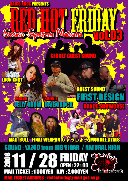 今回はダンスショウケースも ありだしサウンドも面白い感じ なんで予定あわせて遊びに来て ください。 シークレットゲストサウンドも ヤバいっすよーー!! 今回もへネシーkaテキーラいったろうかなーっと オモテマス  [RED HOT FRIDAY vol.3] 11/28[金] AT:CLUB RED pm10:00-am5:00+VIBES メールチケット¥1500 当日¥2000 [GUEST SOUND] FIRST DESIGN SECRET GUEST SOUNDあり [GUEST DANCER] LOON KNOT MAD BULL しょうしょう MURDEE GYALS FINAL WEAPON [SOUND] JELLY GROW