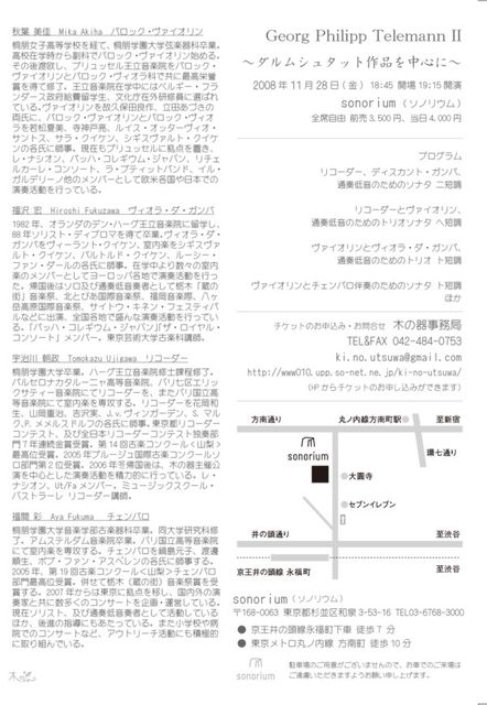 今年1月より始まりました、テレマンのコンサートシリーズの第2弾です。今回はヴィオラ・ダ・ガンバの福沢宏さんをお迎えして、ダルムシュタット作品を中心としたプログラムを組みました。 会場は永福町にあるsonorium。建物のデザイン、音響に大変こだわりのある素敵なホールです。木の器公演では初めて使わせていただく会場ですので、どんなことになるのか楽しみです。(椅子にも響きの工夫があるとか!?) お勤めの方や、初めていらっしゃる方のために、少しだけ開演時間を遅らせてあります。 定員100名ほどの小さめのホールですので、どうぞお