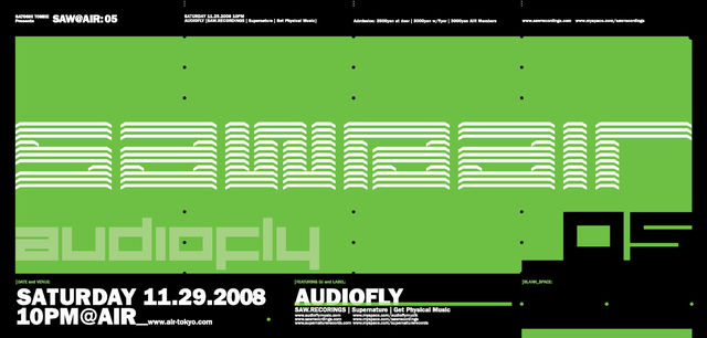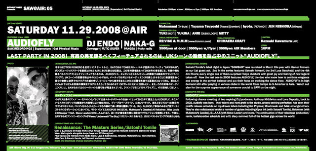 管理人様失礼します! パーティーの告知をさせて頂きます! LAST PARTY IN 2008!有終の美を飾るべくフィーチュアされるのは、UKシーンの話題を独占中のユニット"AUDIOFLY"! SAW @ AIR コミュにも是非ご参加下さい! http://mixi.jp/view_community.pl?id=3046208 2008.11.29(SAT) SATOSHI TOMIIE presents SAW@AIR05 feat. AUDIOFLY 22:00 start door/3500yen with flyer/3000yen AIR MEMBERS/3000yen Featuring DJ:AUDIOFLY (Supernature/SAW.RECORDINGS/Get Physical Music) DJ's:DJ ENDO (Converge+/FUTIC SIL