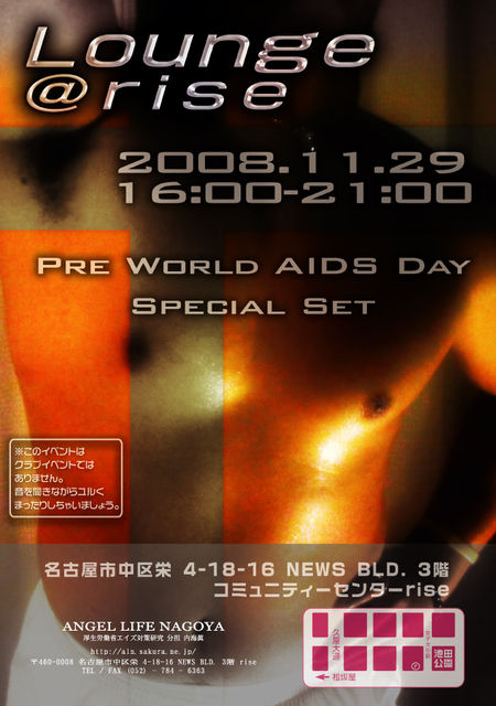 ラウンジ@ライズ Vol.8       2008.11.29 16:00-21:00 - Pre World Aids Day Special Set - コミュニティスペース・rise ツキイチ音系イベント2ヶ月の充電を経て再開! 入場:無料 開場:16:00 終了:21:00 今回のテーマは”Pre World Aids Day Special Set ” LOUNGEは全編HOUSE+HITPOPSでお送りします♪ お気軽にお立ち寄り下さい! ***ラウンジ@ライズとは*** 気楽に立ち寄れるラウンジ+サウンド。 誰でも気軽にHIV予防の情報や クラブで定番のアノ曲を聞けちゃいます! 給料日後でお友
