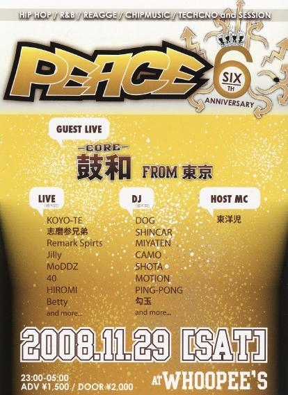 管理人様貴重なスペースありがとうございます。 告知失礼いたします。 来る2008年11月29日(土)京都METROで開催されていた HIP-HOP EVENT『PEACE』が久々ウーピーズにて開催決定exclamation ×2exclamation ×2 今回は6周年記念という事で横浜から鼓和 -core-を招き盛大に開催ぴかぴか(新しい) 出演者には京都を代表するアーティストがずらり目がハート LIVEにDJ TIMEに楽しい一夜になる事は間違いないるんるん 来週末はぜひ京都ウーピーズ『PEACE』にお越し下さいグッド(上向き矢印) ■PEACE -SIX ANNIVERSARY- カラオケGUEST LIVE 鼓和 from東京 カラオケLIVE KOYO-TE/志磨参兄弟
