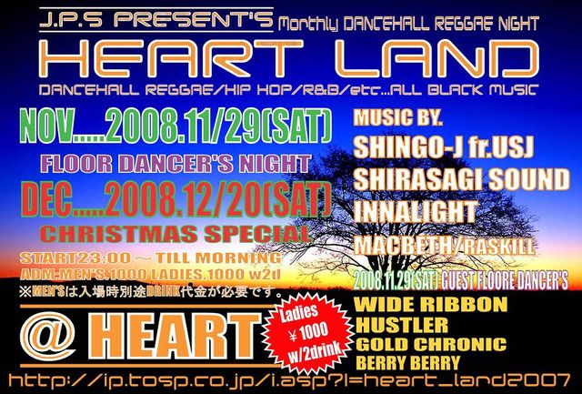 -jps presents- 〜the young star no,1 party〜 ■HEART LAND■vol,11 2008,10,25[sat]@HEART Open 22:00 Start24:00 ADM: GAL\1000[2d] MAN\1500[1d] -MUSIC BY- UNITY SOUN JAPAN SHIRASAGI SOUND INNALIGHT MACBETH RASKILL -FLOOR DANCER- WIDE RIBBON HUSLRE GOLD CHONIC BERRY BERRY &more Info...shirasagi_sound@yahoo.co.jp [HEART LANDコミュ] http://mixi.jp/view_community.pl?id=2870794
