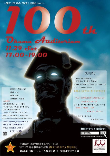 突然の書き込み、失礼いたします。 我々は早稲田大学理工学部を中心に活動をしている、 早稲田大学公認のタップダンスサークルです。 早稲田大学3年の皆様に、イベントのご案内をさせていただきます。 この度、早稲田大学理工学部が100周年を迎えたことを記念いたしまして、 11月29日(土)17時から大隈講堂にて理工100周年を盛り上げようとする有志の複数団体参加によるパフォーマンスイベントを開催いたします。 理工100周年の「足音」を刻む と題し、お送りするのは、フルートロボットとタップダンスのセッション、エレキ