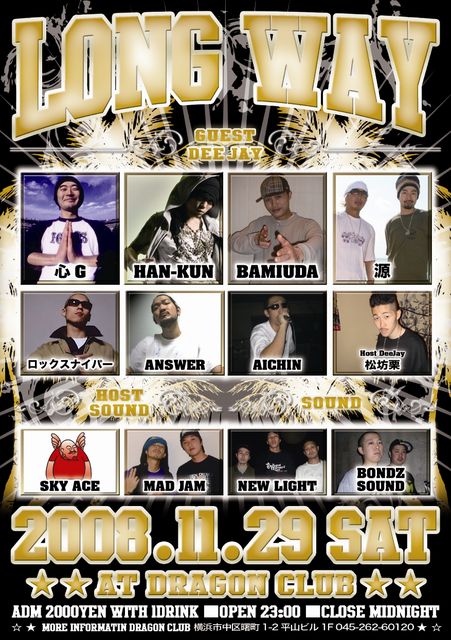11/29(土) LONG WAY @横浜 DRAGON CLUB DEE-JAY HAN-KUN from 湘南乃風 心G MINAMOTO BAMIUDA AICHIN ANSWER ロックスナイパー 松坊栗 SOUND SKY ACE MAD JAM NEW LIGHT BONDZ SOUND ADM 2000YEN1D 24:00〜 当日IDチェックがあります。20歳未満のかたは入場できません。 スカイエースコミュニティー http://m.mixi.jp/view_community.pl?id=1869357&guid=ON