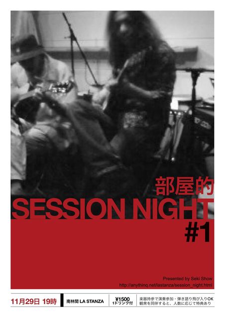 「部屋的」セッションナイト #1 開場:19:00/開演:19:30 参加費:1500円(1drink込み) 楽器持参で参加自由のセッションです! プロ・ギターリスト Seki Showがホストを努めます。 ソロギタータイムもあり! ※電気楽器・ドラムは22:00まで。 弾き語りの場合、基本2曲。お客さん一人同伴につき+1曲(上限5曲)、4人呼んだら本人チャージを無料に(但し、ドリンクは要オーダー)。 定期的に開催するセッションナイト。 参加ごとにたまるスタンプを集めると、La stanzaで使える3000円分の回数券と引き換えられます。聴衆を呼ぶとその分