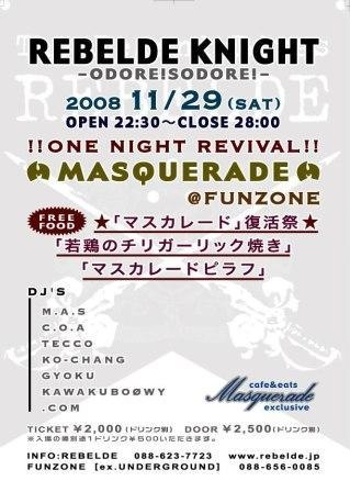 REBELDE KNIGHT -ODORE!SODORE!- !! ONE NIGHT REVIVAL !! MASQUERADE 2008 11/29 (SAT) OPEN 22:30 〜 28:00 TICKET:¥2000(ドリンク別) DOOR:¥2500(ドリンク別) ※入場の際、別途1ドリンク代¥500いただきます。 ☆『マスカレード』復活祭 ☆ 「若鶏のチリガーリック焼き」 「マスカレードピラフ」 DJ'S: M.A.S C.O.A TECCO KO-CHANG GYOKU KAWAKUBOOWY .COM この夜、伝説のピラフ屋さん『MASQUERADE』が一夜限りの復活っ!!! 更に「若鶏のチリガーリック焼き」「マスカレードピラフ」が FREE