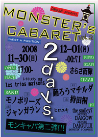 今回もまた2DAYS! 先ずは現段階での詳細です! 決まり次第、随時アップして参ります。 宜しくお願いします!!! ========================== 【初日】 [日時] 11月30日(日) ※夜の部のライブを予定 [場所] レトワメゾン京都 http://www.ctn139.com/shop_kyoto.html [LIVE] モノポリーズ(三重)http://www.myspace.com/monopolys1 ジャンガラン(京都)http://jung-grung-tanakapro.cocolog-nifty.com/ [チケット] 無料 (投げ銭:ワンオーダー制) ==============