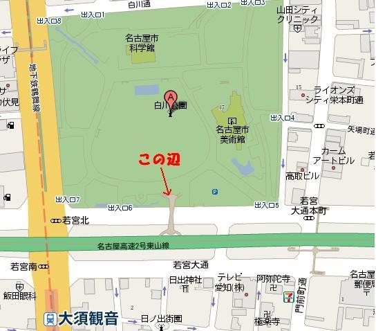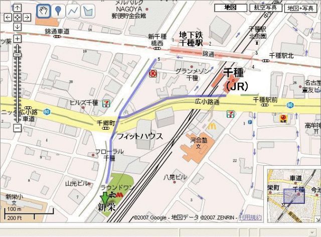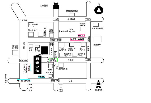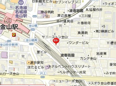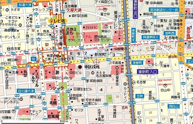地下鉄新栄から広小路通りに出て広小路葵の交差点を渡り広小路通り沿い栄方向に向かい歩く。CBC中部日本放送の手前角(広小路新栄1丁目)を左に曲がりすぐ1本目をまた左に曲がる。そのまま30