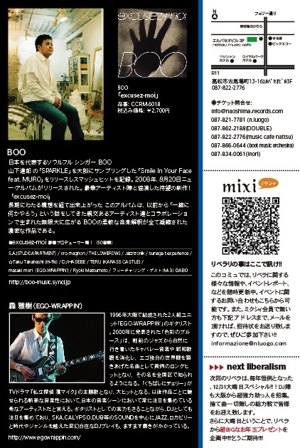 ファンキーなラップのフローとソウルフルな歌声を併せ持ち、数多くの素晴らしい作品の数々を残してきた、大阪出身のソウルマン『BOO』が、讃岐うどんの里、香川県高松市での初上陸ライヴ決定!!!!!!!!!!!!!!!!!