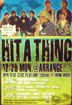 いよいよ今夜です☆ 告知です。 HITA ★ THING SUNSHINE ENT.& BACKYARD MOVEMENT PRESENTS 12月29日(MON) ARRANGE OPEN 18:00 CLOSE 25:00 ADM 1,500yen (要1DRINK ORDER) ☆SPECIAL GUEST SOUND☆ CHOMORANMA fr.fukuoka FIRE CORL fr.kitakyusyu ☆GUEST DEEJAY☆ 3D fr.fukuoka TETRA-B fr.fukuoka NASU fr.fukuoka SOUND SELECTER KEY-BO fr.fukuoka UNEE GOTOKEN SUIKYO ☆HOST SOUND☆ SUNSHINE