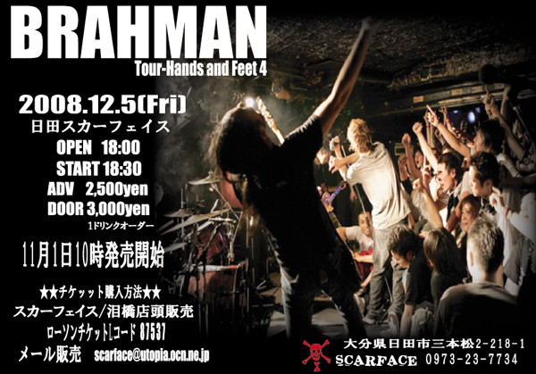 2008年12月5日(金) 日田スカーフェイス 「Tour -Hands and Feet 4」 <出演> ★ブラフマン 他 OPEN/18:00 START/18:30 前売り¥2,500 当日¥3,000 ※要1ドリンクオーダー ★★★★★★★★★★ 「チケット発売日」 11月1日(土) 「チケット購入方法」 ★ローソンチケッット Lコード87537 ★スカーフェイス店頭販売 11月1日午前10時〜 枚数に限りが御座います。 早めのご購入をお勧めいたします。 尚、Mixi、メールでの販売も11月1日午前10時より開始したします。 それ以前の予約、販売は出来ま