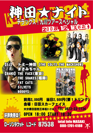 2008年12月13日(土) 日田スカーフェイス 「神田★ナイト」 〜デラックス!九州ツアースペシャル!〜 <出演> <DJ> ★トミー神田(THE COLTS THE MACKSHOW) ★マサミちゃん <BAND> ★THE FACE(東京) ★THE SHAKES(福岡) ★FAT CATS ★SILVETS ★BODDYS OPEN/18:00 START/18:30 前売り¥2,000 当日¥2,500 ※要1ドリンクオーダー ★★★★★★★★★★ 「チケット発売日」 11月1日(土) 「チケット購入方法」 ★ローソンチケッット Lコード87538 ★スカーフェイス店頭販売 尚、Mixi、