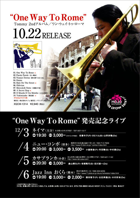 いよいよOne Wayツアー、九州に出陣です。 九州のみなさま、よろしくお願いします。 また、参加表明、激励の言葉など、書き込んでいただけると嬉しいです。 では明日の夕方、さんふらわあで出発します。 九州でお会いしましょう! ☆12/3(水) 大分 ネイマ 安藤令子(P) きむりん(B) 山野井隆(Ds) 19:30 3000円 1ドリンクつき ☆12/4(木) 博多 ニュー・コンボ http://www.f2.dion.ne.jp/~combo/index.html 小國雅香(P) 丹羽肇(B) 中村健(Ds) 20:00 \3000/3500 ☆12/5(金) 小倉 カサブランカ http://w
