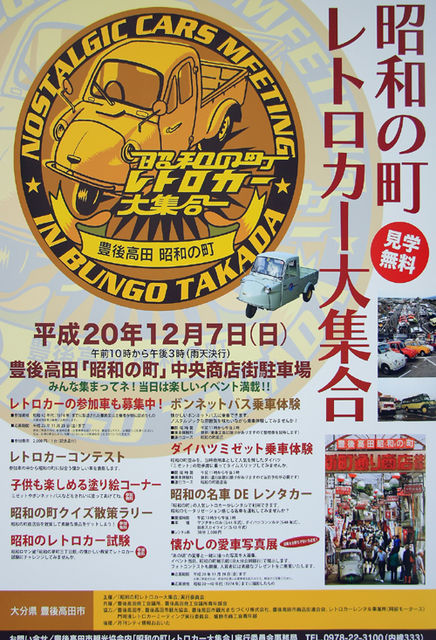 http://www.city.bungotakada.oita.jp/osirase/ibent/retoro.jsp ○開催日時: 平成20年12月7日(日曜日) 午前10:00〜午後3:00(雨天決行) ○開催場所: 豊後高田「昭和の町」中央商店街駐車場 ●ボンネットバス乗車体験 ●ダイハツミゼット乗車体験 ●昭和の名車DEレンタカー ●レトロカーコンテスト ●懐かしの愛車写真展 ●昭和の町クイズ散策ラリー ●昭和のレトロカー試験 ●子どもも楽しめる「塗り絵」コーナー お問合せは:豊後高田市観光協会 電話:0978-22-3100(内線333)