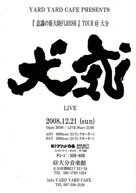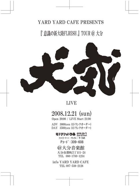 管理人様告知失礼致します 不適切でしたら削除をお願いします。 ついに! 犬式!しかもワンマンで!大分にやってきます 数多くのフェス、イベントで圧倒的な支持を得ている 犬式のライブを是非、是非、体感してください!! 皆様、体力つけてご来場ください。 YARD YARD CAFE PRESENTS LIVE 犬式 『意識の新大陸FLRSH』ツアー@大分 2008/12/21(SUN) OPEN20:00 START21:00 @大分音楽館(大分市都町2-1-24) ADV 3000yen(1ドリンクオーダー) DAY 3500yen(1ドリンクオーダー) 電子チケットぴあ(フ