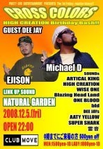 12/5、今年最後のクロスカラーズはHIGH CREATIONのBirthday special!! ゲストに京都からMichael D 大阪からEJISONそして地元、滋賀からはNATURAL GARDENを招いてのダンスホール!!