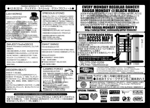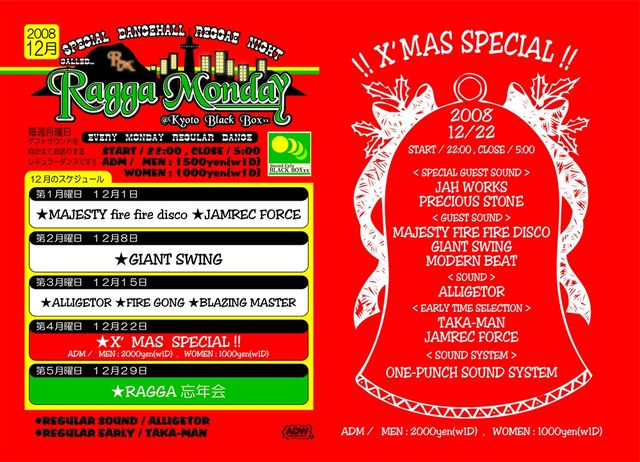 『RAGGA MONDAY』 2008.12.1(MON) @京都BLACK BOXxx 京都市中京区河原町通り三条下る二丁目山崎町236-2ルミエール・ド・三条ビル4F START 22:00 CLOSE5:00 WOMEN \1000 w1d MEN \1500 w1d 【1st MONDAY REGULAR】 MAJESTY FIRE FIRE DISCO 【SOUND】 ALLIGETOR 【EARY SELECTION】 TAKAMAN JAMREC FORCE 【JERK CHICKEN】 JERK☆MAN 『RAGGA MONDAY』1週目恒例の『JERK☆MAN』のおいしいジャークチキンご堪能あれ!! 12月の始まり、週の始まりは『RAGGA MONDAY』で朝まで存分にお楽しみあれ!!