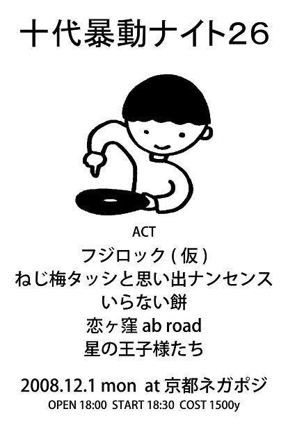 活動休止中のTHE NOより星の王子様たち出演イベントのお知らせです! 共演は東京から銀杏BOYZのフロンアクトを務めた事もある、ハードコアと4畳半フォークの熱さを併せ持った歌ものバンド、フジロック(仮)! 同じく東京よりこれまた熱い弾き語りの、恋ヶ窪ab road! 京都よりはdOPPOのフロントマン橋本くんのソロ、いらない餅! そして京都の人に是非見てもらいたい、ねじ梅タッシと思い出ナンセンス! こんなラインナップでおおくりします! □2008年12月1日(月) at京都ネガポジ http://www.negaposi.net/ 『十代暴動ナイト26』
