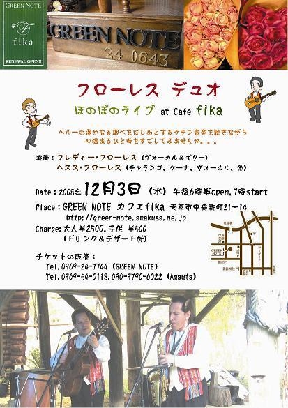 GREENNOTEで初イベントが開催されます。 フローレスデュオ ほのぼのライブ ラテン音楽を聴きながら心温まるひと時をすごしてみませんか。。。 2008.12.3(水) OPEN16:30 START19:00 Chage ¥2,500(大人) ¥500(子供) 飲物とお菓子がつきます。 お時間があるかたはぜひお越し下さい! チケット販売 GREEN NOTE 0969-24-7744 Amauta 0969-54-0118