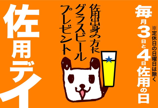 12月3と4は【佐用デイ】 《毎月3日と4日は佐用デイ》 ※日曜日を除く 12月3日と4日が佐用デイ! 佐用出身の方に特典あり! プレゼント 【グラスビール】をゲット! テンではこの日に お越し下さった 佐用出身の方を大歓迎!!! テンより佐用出身の方に 歓迎の【グラスビール1杯】を プレゼントいたします!! 誰かしら 佐用出身の方に会えるかも! 佐用出身の方どなたでも大歓迎! ご来店の際、佐用のどこ出身ですと お気軽にお申し付け下さい。 佐用人が集まって焼うどんを 食らうオフ会も大歓