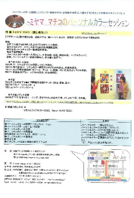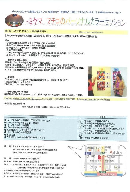 管理人さま いつもお世話になっておりますm(_ _)m 株式会社アートジョイです。 講座の案内をさせて下さいませ! 年に一度ですが今年もトミヤマ マチコ先生の講座を今年も開催させて頂くことになりました。 少し時間は短くなりますが、お安くリーズナブルになりお得です♪ みなさま、お誘い合わせの上、如何ですか? 開催日:2008年12月3日(水)18:30〜20:00 参加費 3,500円 NHK教育TVおしゃれ工房に出演!そのパーソナルカラー理論は明解で分かりやすく高く評価され、視聴者の強い要望で再放送された実績を持つ。あな