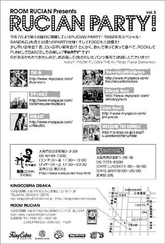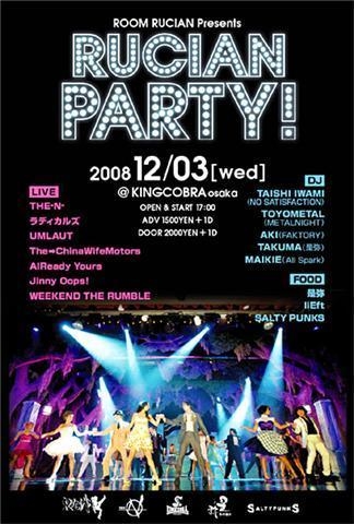 2008.12.3(wed) -ROOM RUCIAN Presents- 『RUCIAN PARTY! Vol.5』 @KING COBRA http://king-cobra.net/first.html OPEN & START 17:00 ADV \1500(+1D \500) / DOOR \2000(+1D \500) [LIVE] THE-N- ラディカルズ The→China Wife Motors Jinny Oops!! UMALAUT WEEKEND THE RUMBLE AlReady Yours [DJ] TAISHI IWAMI(NO SATISFACTION) TOYOMETAL(METALNIGHT) AKI(FAKTRY) TAKUMA(是弥) MAIKIE(ALL Spark) [FOOD] 是弥 liEft SALTY PUNKS