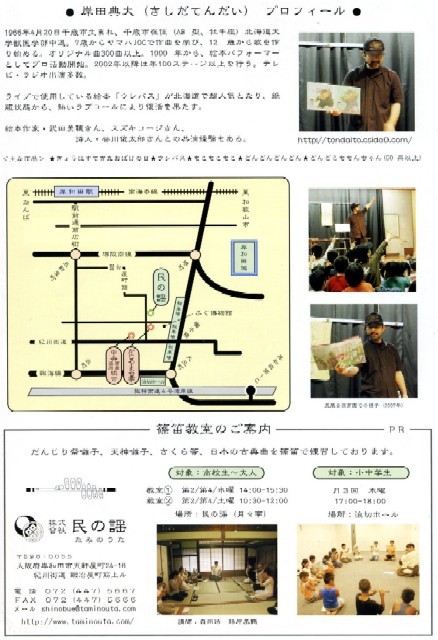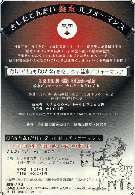 ◎おとなもこどもも楽しめる「絵本パフォーマンス」 時間:16時〜17時 会場:岸和田中央共同商業組合(岸和田市北町9-16) 料金:おとな500円、こども250円(当日100円増) ◎おとなだけで楽しむ「絵本パフォーマンス」 出演:絵本パフォーマー岸田典大ほか 時間:20時〜21時 会場:かじやまち亭(岸和田市北町10-1) 料金:1000円(当日200円増) チラシはこちら↓ http://tendaikun.net/test/kisiwada1.pdf(表) http://tendaikun.net/test/kisiwada2.pdf(裏) 主催・民の謡(http://www.taminouta.com/) チラシデザイン・六覚