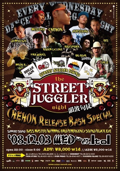 ■場所 ・Club ItoI ■住所 ・〒542-0086 大阪市中央区西心斎橋1-10-25 コモド西心斎橋ビルB1 ■日程 ・2008/12/3(水) ■時間 ・OPEN 21:00〜05:00 ■PRICE ・ADV¥2000(W/1D) ・ADM¥3000(W/1D) ■TICKET ・ローソンチケット[Lコード:51311] ■SPECIAL LIVE SHOW CASE ・CHEHON ■SP GUEST DEEJAY ・ARM STRONG ・DOMINO-KAT ・MICKY RICH ・BES ・BIG BEAR ・MISON-B ・TAK-Z ■SP GUEST SOUND ・RED SPIDER ・RODEM CYCLONE ・FIRE WORKS ■STREET JUGGLER SOUND ・BREAK JAM ・GM SNIPER