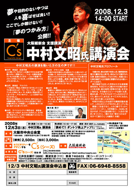 褒めるところ探しの調査 C’sの原と申します。 たくさんの方に聞いて頂きたいです! 私も・・・何の為に働くのかがわからなかったんです。 でも、今ははっきりと言えます。 ありがとうございます! 中村文昭さん!! 12月は大変お忙しいとは思いますが、ぜひ来て頂きたいと思っています。 よろしくお願いいたします。 【日時】 平成20年12月3日(水) 開場:13:00〜 開演:14:00〜 終了予定:17:00 【スケジュール】 第一講座(14:00~15:30)中村文昭氏講演会 第二講座(15:40~17:00)「褒めて!!ダン