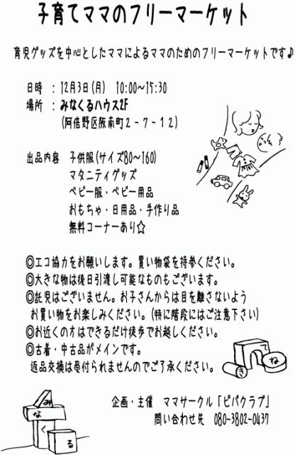 育児グッズを中心としたママによるママのためのフリーマーケットです♪ 日時 : 2007年12月3日(月) 10:00〜15:30 場所 : みなくるハウス2F (阿倍野区阪南町2−7−12) 出品内容 子供服(サイズ80〜160) マタニティグッズ ベビー服・ベビー用品 おもちゃ・日用品・手作り品 無料コーナーあり☆ ◎エコ協力をお願いします。買い物袋を持参ください。 ◎大きな物は後日引渡し可能なものもございます。 ◎託児はございません。お子さんからは