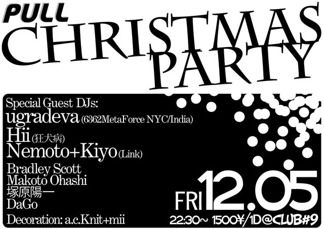 PULL CHRISTMAS PARTY FRI12.5@CLUB#9 22:30〜 1500\/1D SPECIAL GUEST DJ'S ugrdeva(6362MetaForceNYC/India) HII(狂犬病) Nemoto+Kiyo(LINK) Bradley Scott Makoto Ohashi 塚原 陽一 DaGo Decoration:a.c.Knit + Rei