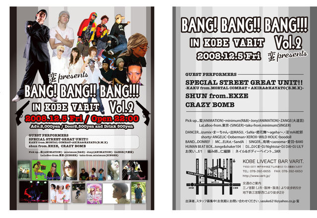 第一金曜日ONE BLOODレギュラーイベント 『PEACE RALLY VOL.3』 2008.12.5[fri]22:00〜ALL NIGHT \500 1drink 場所→club ZANZIBA JR元町駅から徒歩5分 □■出演■□ −SOUND− ONE BLOOD(KEN) MRC BURI BURI SOUND EVER GREEN AND MORE JAH GUIDE(SOUL) ‐RAB A DUB‐ MAROON from ONE BLOOD singer SEIKO RYO and more OPEN MICなんで、我こそはというDEEJAY、SINGER募集中です。 −HIP HOP− MC META 言葉ASAB!MCs TWENTY-4 DJ BON and more 12月5日金曜日、まだ予定が入ってない方、club ZANZIBAで、美味しいお酒を飲みながら爆音で
