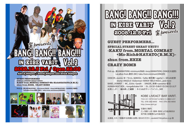 告知失礼します! 第一金曜日ONE BLOODレギュラーイベント 『PEACE RALLY VOL.3』 2008.12.5[fri]22:00〜ALL NIGHT \500 1drink 場所→club ZANZIBA JR元町駅から徒歩5分 □■出演■□ −SOUND− ONE BLOOD(KEN) MRC BURI BURI SOUND EVER GREEN AND MORE JAH GUIDE(SOUL) ‐RAB A DUB‐ MAROON from ONE BLOOD singer SEIKO RYO and more OPEN MICなんで、我こそはというDEEJAY、SINGER募集中です。 −HIP HOP− MC META 言葉ASAB!MCs TWENTY-4 DJ BON and more 12月5日金曜日、まだ予定が入ってない方、club ZANZIBAで、美味しいお酒