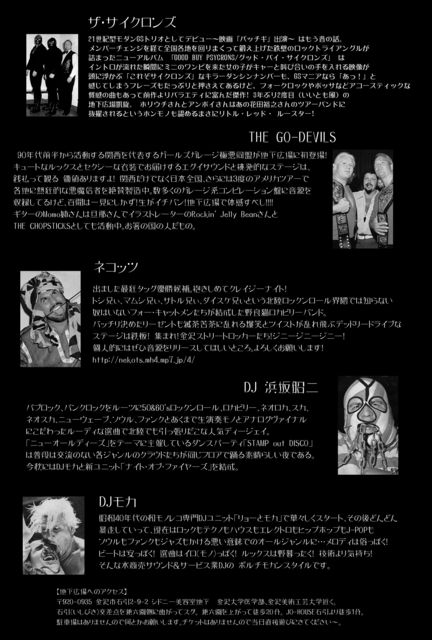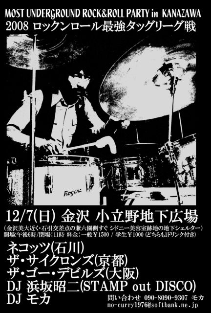 【2008ロッキンロール最強タッグリーグ戦決勝】 12/7(日) 金沢/小立野地下広場 JO-HOUSE近く / 旧シドニー美容室地下倉庫 午後6時頃から10時頃まで 観戦料¥1500(1ドングリ付) 当日も前売りも同額です 【参戦】 ★ザ・サイクロンズ(京都) 最強タッグ京都大会を勝ち上がったのは我らがサイクロンズ! 21世紀型モダンGSトリオとしてデビュー〜映画「パッチギ」出演〜 はもう昔の話。夢DVDショップ「フリーク」もはるか昔・・・ メンバーチェンジを経て全国各地を回りまくって鍛え上げたポリス ばりの鉄壁のロックトライ