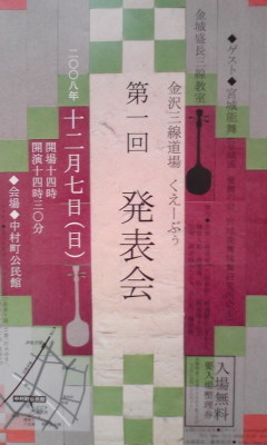 石川の自転車仲間 の皆さんこんにちは 以前メンバーに加えていただいた おりたじ です。 通っている 三線(さんしん)教室で↓の沖縄民謡の発表会を行います。 唄・三線・踊りさらには寸劇ありのイベントです。 お越しいただければ幸いです。 金城盛長三線教室 金沢三線道場「くえーぶぅ」第一回発表会 こちらにも紹介があります http://www.kinjo34n.jp/kanazawa.html#happyoukai 【日時】2008年12月7日(日) 14時開場・14時30分開演 【会場】中村町公民館(中村会館) 金沢市中村町10-35(駐車場なし、
