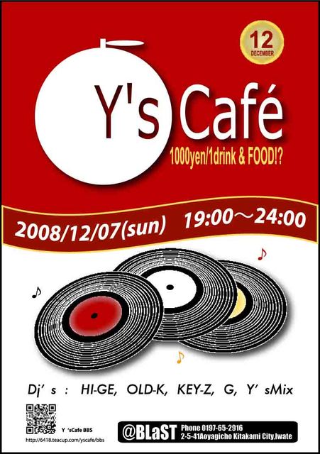 今夜のメニュー 「鶏肉のトマトソース煮」 「明太子パスタ」 どえす 数量限定ですのでお早めに〜 「Y'sCafe12月号」2008年11月2日(sun) 19:00 open 1000yen / 1drink & FOOD!? @BLaST(岩手県北上市) Y'sCafe DJ's HI-GE OLD-K KEY-Z Y's Mix 助っ人DJ CEREAL